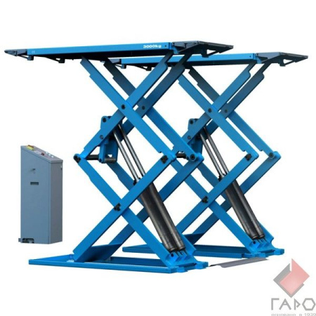 • Ножничный механизм укомплектован четырьмя гидравлическими цилиндрами. Очень надёжный механизм.• Разблокировка стопорного механизма с помощью пневматического механизма на управляющей стойке подъемника.