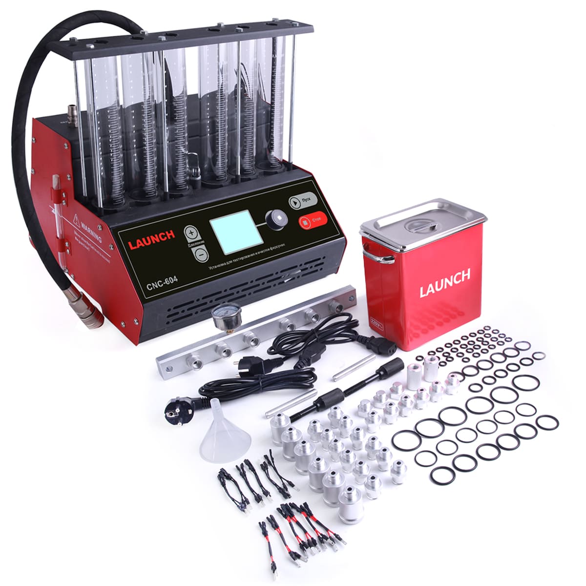 Launch CNC-604 — облегченная версия стенда для тестирования и ультразвуковой очистки форсунок CNC-603A. Отличительной чертой CNC-604 являются малые габариты, отдельно стоящая ультразвуковая ванна и ручной слив жидкости. По режимам работы и комплекту адаптеров, стенд идентичен 603A.