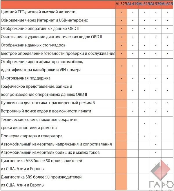 Сравнительная таблица приборов Autel AutoLink