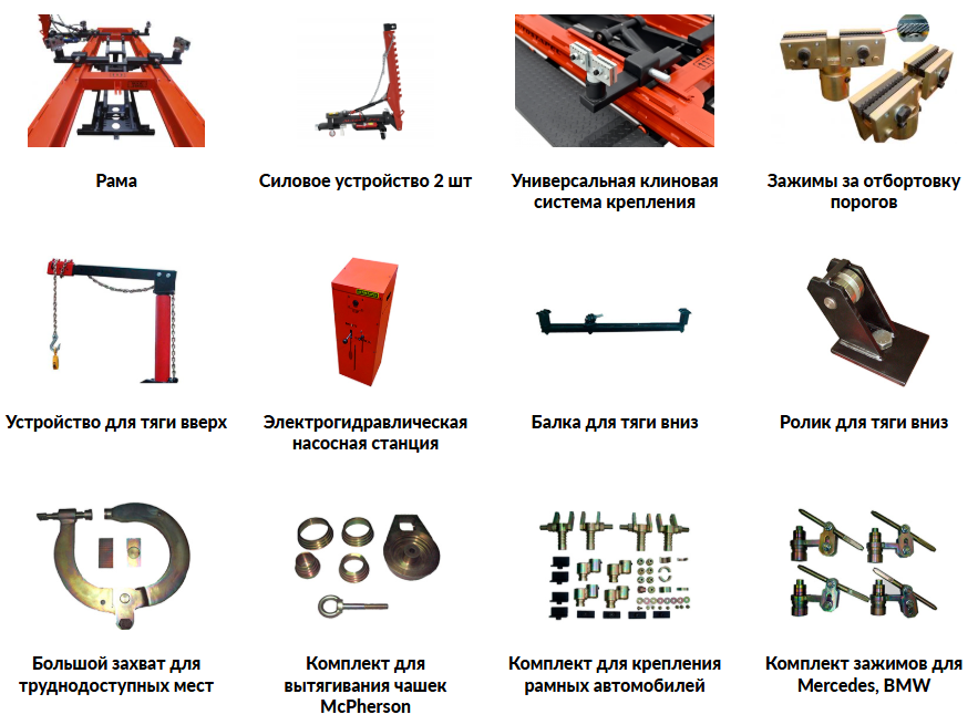Усиленные зажимы за отбортовку порогов имеют оригинальную конструкцию разработанную с учетом устранения эффекта сползания и срыва. Узел сопряжения зажима со стойкой фиксации позволяет закрепить автомобиль с искривленной геометрией порогов не ограничивая дальнейших перемещений детали кузова в плоскости и одновременно удерживать его в момент исправления. Конструкция зажимов не имеет аналогов и разработана с учетом опыта и пожеланий российских мастеров кузовного дела.