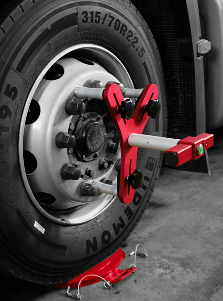 Для измерения грузовиков или полуприцепов с установленными на них легкосплавными колёсными дисками необходимо использовать специальные ножки. Входящие в базовую комплектацию магнитные ножки не подойдут. Специальные ножки монтируются и фиксируются на шпильку ступицы колеса. После монтажа на три шпильки к ним крепится колёсный адаптер с лазерной головкой.